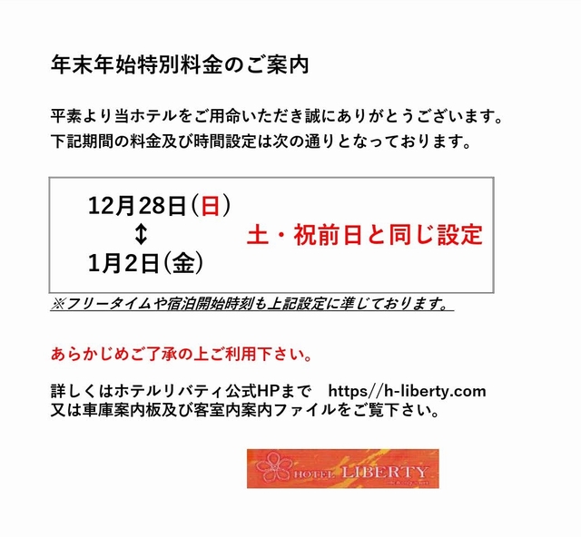2025年12月28日(日曜日)~2026年1月2日(金曜日) 土曜・祝前日と同じ料金設定